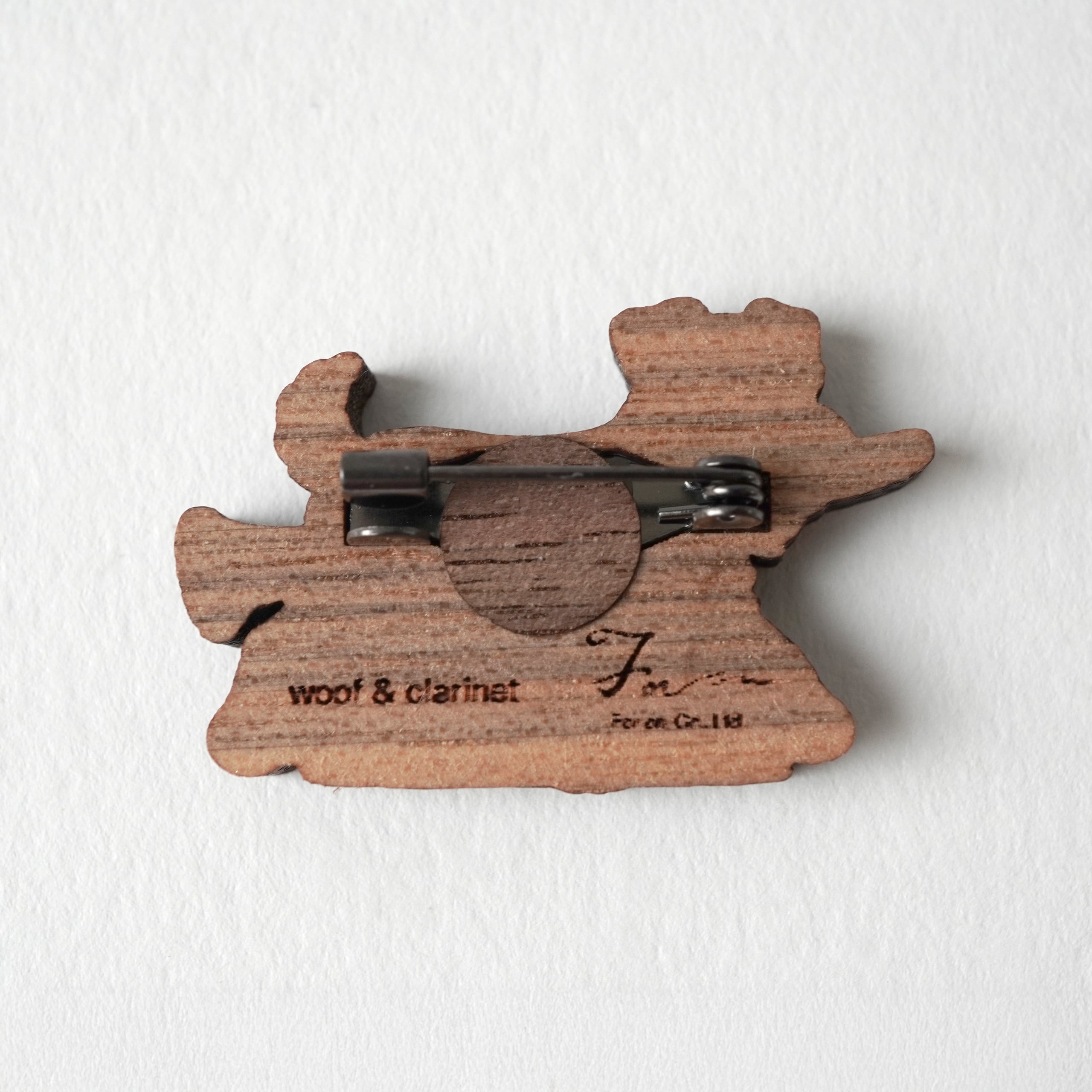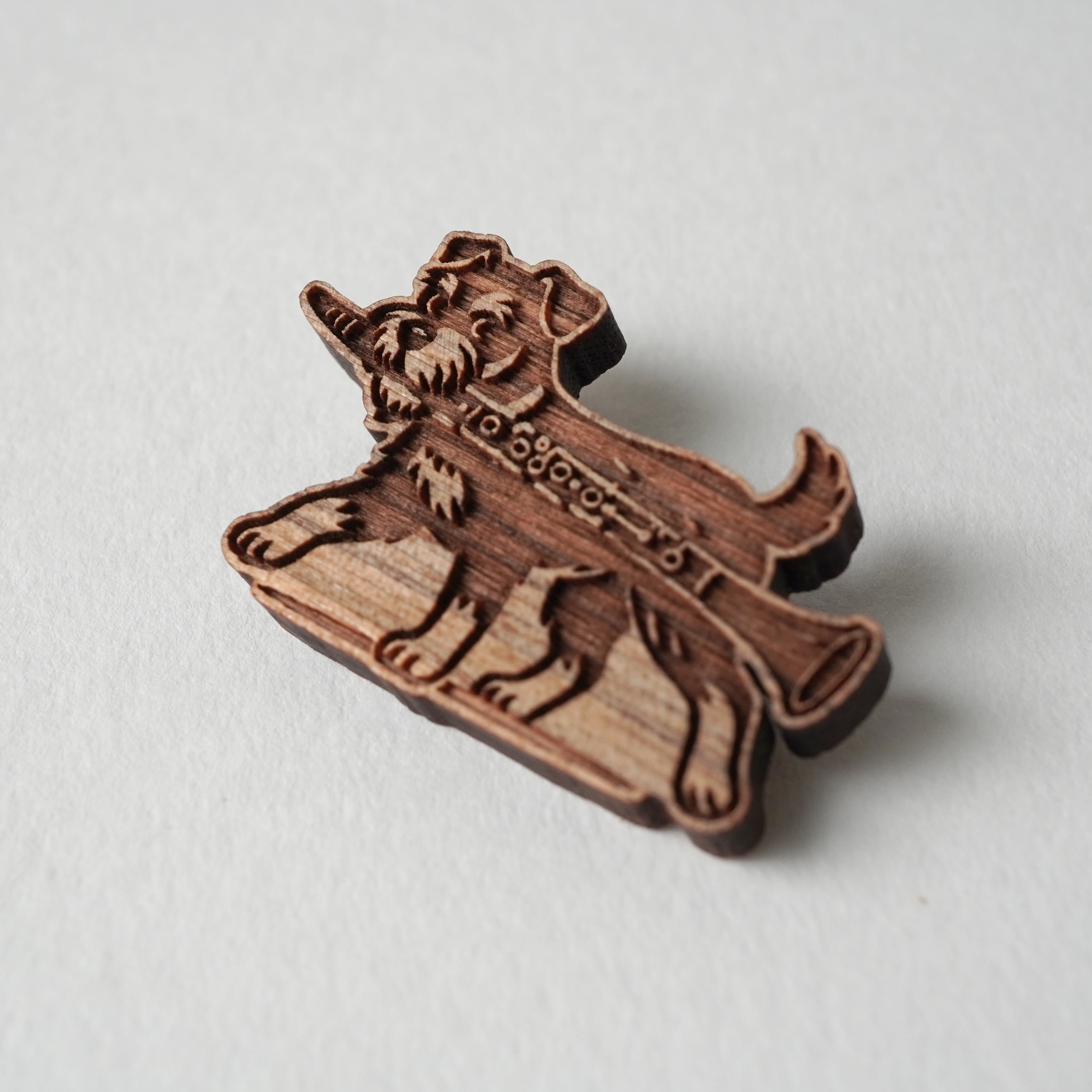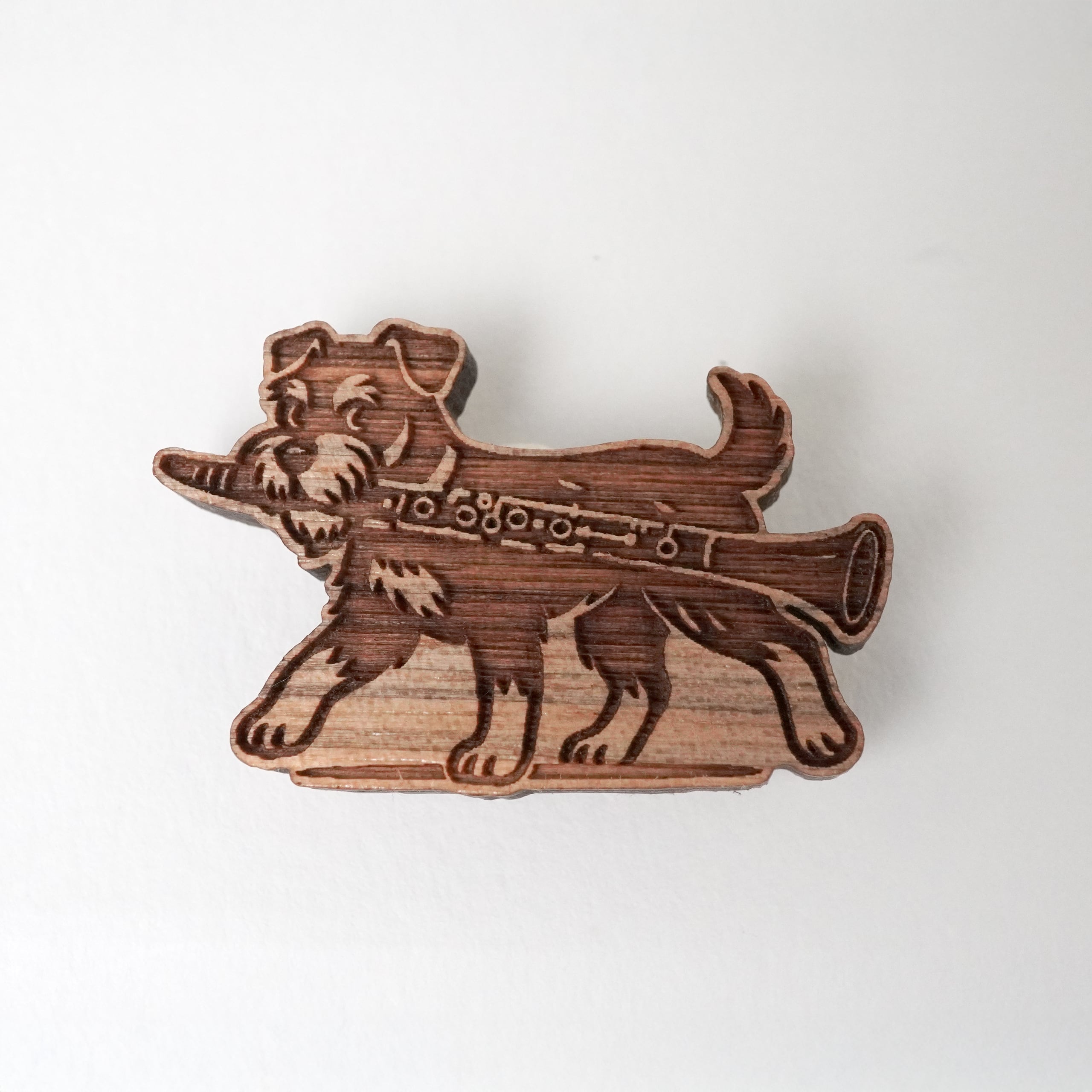 クラリネットを大切そうに抱え、軽やかに一歩を踏み出す犬。