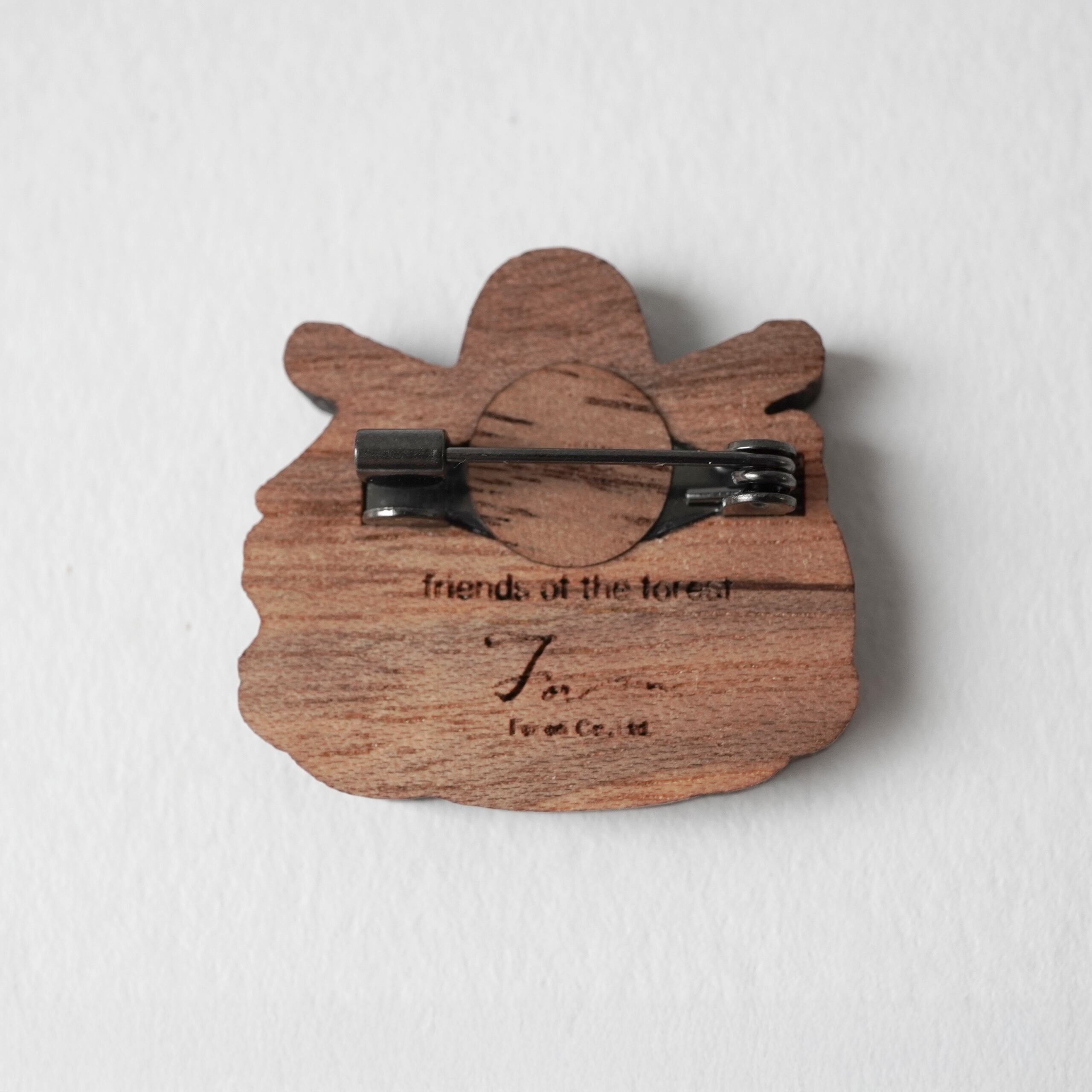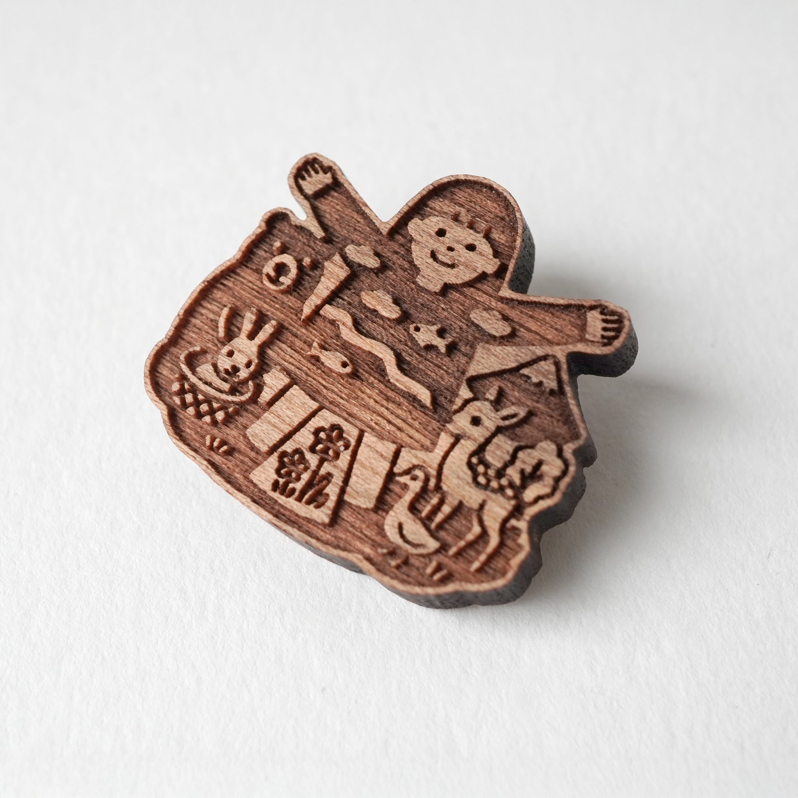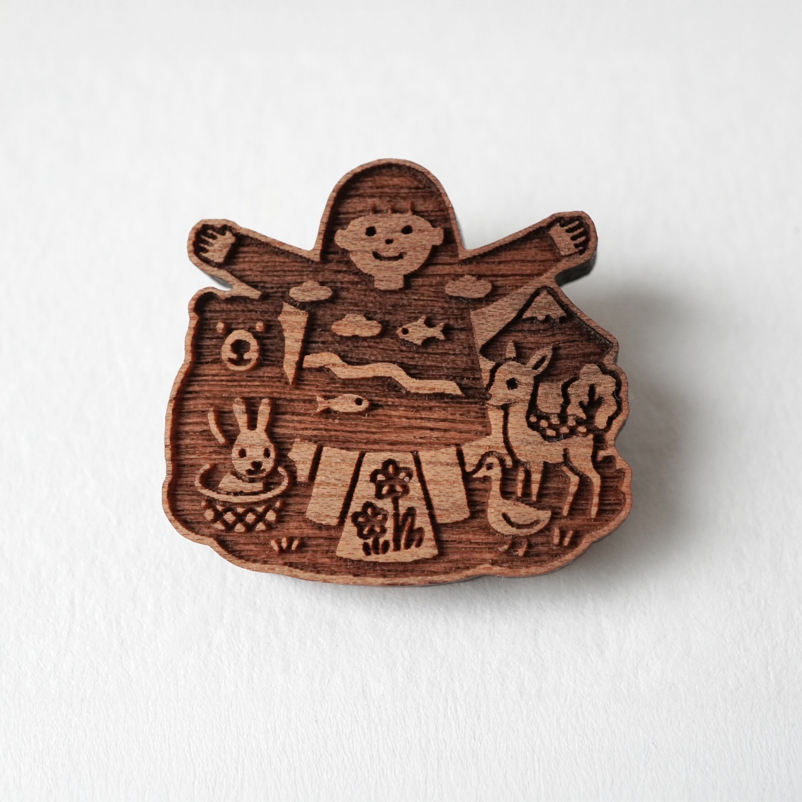 国産胡桃の木でつくった、森の仲間たちを描いた木のブローチです。