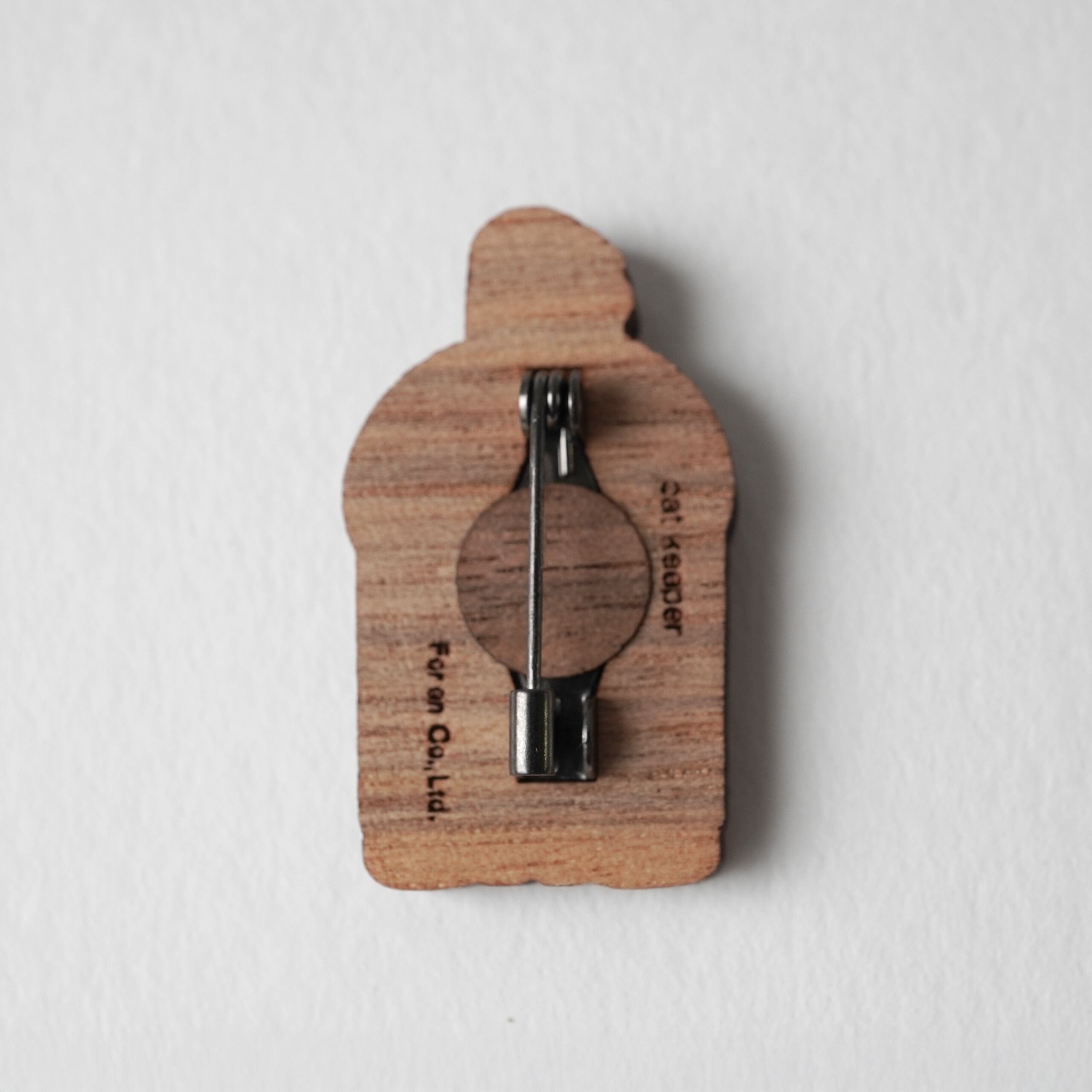 国産胡桃の木でつくった、ネコをやさしく抱く人物モチーフの木のブローチです。